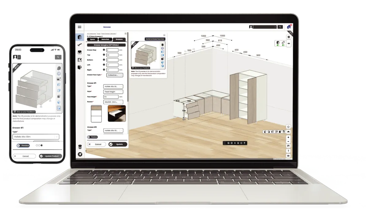 Use the online portal to customise sizes, colours and finishes — pricing updates in real time.